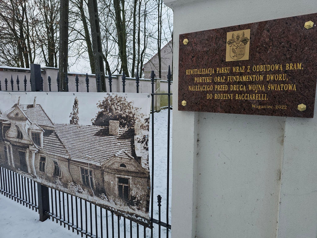 Tablica i baner dworu w Wagańcu.